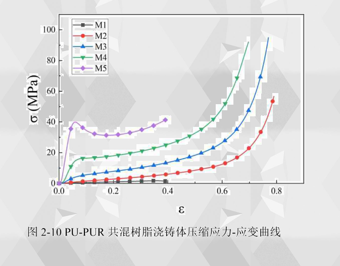 PU-PUR共混樹脂澆鑄體的壓縮應(yīng)力-應(yīng)變曲線如圖2-10所示,可以看出,M4和M5聚脲樹脂澆鑄體在應(yīng)力-應(yīng)變曲線上出現(xiàn)了明顯的線彈性階段和屈服階段。在應(yīng)變達(dá)到0.39的時(shí)候M1聚氨酯和M5聚脲樹脂澆鑄體都已經(jīng)處于變形失效的狀態(tài),聚氨酯澆鑄體發(fā)生扭曲變形失效,聚脲澆鑄體發(fā)生脆性斷裂失效。而共混樹脂澆鑄體M2、M3和M4在應(yīng)變達(dá)到0.5以上時(shí)才開始逐漸失效且擁有更長的平臺段,失效應(yīng)變分別為0.64、0.59和0.51。說明在應(yīng)變率較大的情況下,M2、M3和M4樹脂澆鑄體的壓縮力學(xué)性能 要強(qiáng)于單獨(dú)的M1聚氨酯和M5聚脲,可以承擔(dān)更大的壓縮位移而不失效。