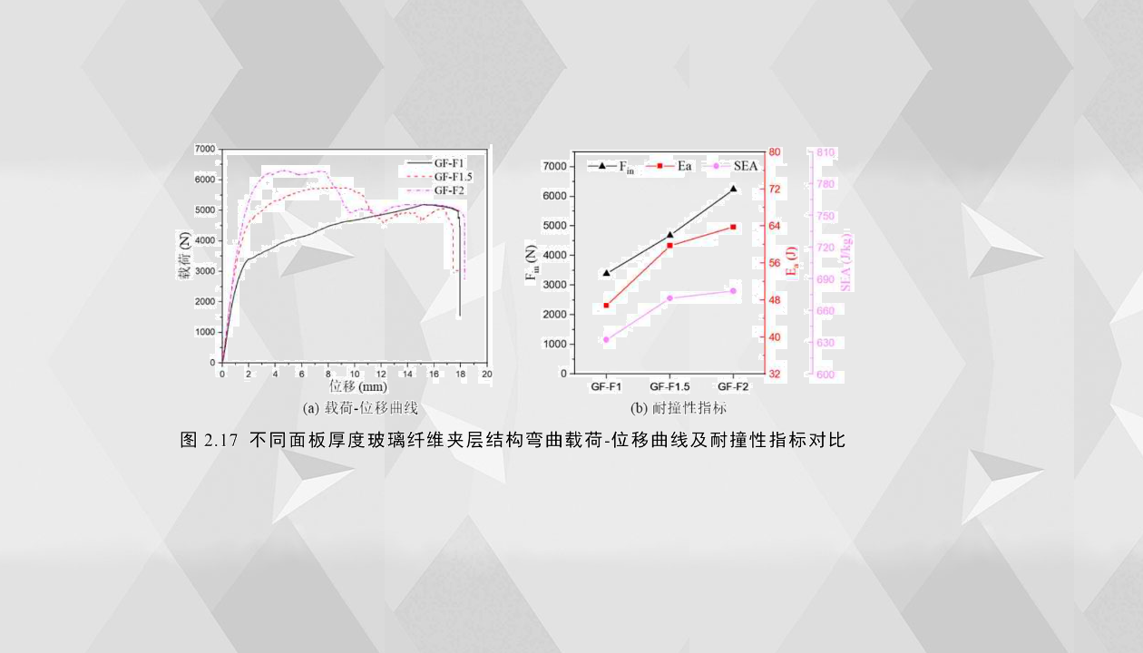 2.4.1面板對(duì)結(jié)構(gòu)耐撞性能影響——E圖2.17(a)比較了不同面板厚度玻璃纖維夾層結(jié)構(gòu)的載荷-位移曲線,可以看出,三者都屬于曲線類型Ⅲ,GF-F1與GF-F1.5的臨界失效模式為壓痕壓入(IN),其發(fā)生臨界失效之后載荷并沒有下降,只是增加幅度減少,這和CF-F1類似。GF-F1從加載開始到試件整體完全失去承載能力,未出現(xiàn)明顯的較為緩慢的載荷下降。與GF-F1不同的是,GF-F1.5在彎曲位移9mm左右時(shí),還出現(xiàn)芯層剪切裂紋以及后續(xù)的界面失效,載荷下降較多。GF-F2的臨界失效模式出現(xiàn)芯層剪切(CS)和壓痕壓入(IN)兩者的組合,在出現(xiàn)失效后的小段位移內(nèi),載荷沒有明顯下降趨勢(shì),而是基本保持相對(duì)恒定;當(dāng)加載位移繼續(xù)增加,出現(xiàn)明顯的芯層裂紋以及后續(xù)的界面失效,載荷顯著降低,這與GF-F1.5的后屈曲失效機(jī)理相似。