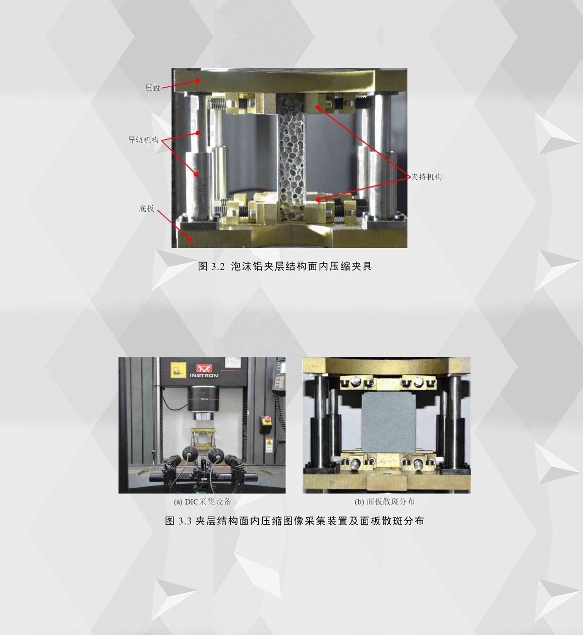 本章泡沫鋁夾層結(jié)構(gòu)面內(nèi)壓縮試驗(yàn)所用到的實(shí)驗(yàn)加載機(jī)器為INSTRON5894萬能試驗(yàn)機(jī),以恒定壓縮加載速率1mm/min作用在壓盤上??紤]到過大的加載位移可能超出夾層結(jié)構(gòu)的承載能力,對(duì)其過大的變形研究意義不大,因此本章分析所有試件的極限加載位移的設(shè)定為5.5mm。為了獲得芯層泡沫鋁的破壞形式和面板的屈曲過程,對(duì)其側(cè)面(即圖3.2所示試件位置)進(jìn)行圖像采集;與此同時(shí),采用數(shù)字圖像相關(guān)技術(shù)(DIC)測量夾層結(jié)構(gòu)面板的變形量,如圖3.3所示(a),根據(jù)DIC技術(shù)采集原理,在開始面內(nèi)壓縮試驗(yàn)之前需要對(duì)夾層結(jié)構(gòu)面板表面噴涂啞光白漆作為底漆,等待底漆晾干之后再噴啞光黑漆,形成可以被DIC采集設(shè)備識(shí)別的散斑,面板處理之后散斑分布效果如圖3.3(b)所示。