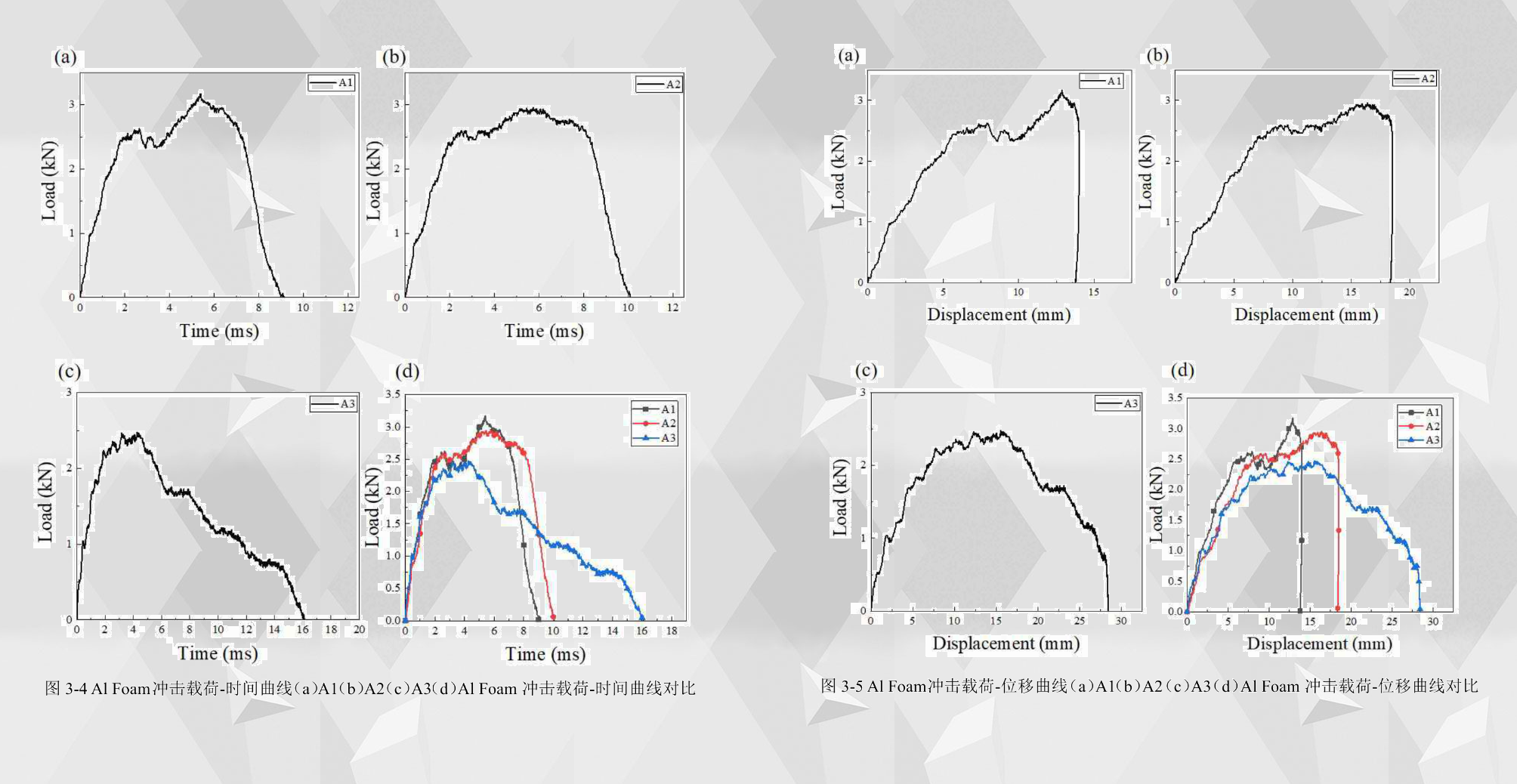 如圖3-4所示為Al Foam板在30J、40J和50J落錘沖擊能量下的載荷-時間曲線圖。 從圖中可以看出,Al Foam板在落錘沖擊荷載下的載荷-時間曲線分為三個階段。在第一個階段,在沖擊作用下,荷載隨著時間而呈現(xiàn)直線上升趨勢,三種沖擊能量下的載荷-位移曲線圖的第一階段斜率都很接近。在第二個階段,曲線開始波動上升,直到上升到載荷的最大值。A1的沖擊峰值載荷為3170N,A2的沖擊峰值載荷為2957N,A3的沖擊峰值載荷為2475N,從沖擊峰值載荷可以看出,沖擊能量為30J和40J時,其沖擊峰值能量相近,這是由于沖頭未能穿透Al Foam板 ,Al Foam板的自身強度使得沖擊載荷維持在較高水平,而在沖擊能量為50J時,高沖擊能量下沖頭已經(jīng)穿透了Al Foam板,Al Foam板的沖擊中心區(qū)域已經(jīng)破壞,所以其沖擊峰值能量較低。在第三個階段,沖擊荷載開始隨著時間下降,A1和A2的載荷下降速度快于A3,這是由于A1和A2未能擊穿Al Foam板,沖頭在沖擊過程中停止較快,而A3由于沖頭在沖擊過程中穿透了Al Foam板,所以其載荷下降速度較慢。